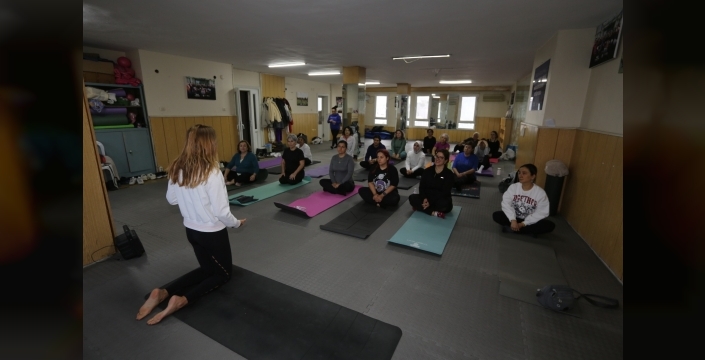 Haftanın ortasında bir araya gelen kadınlar, yoga ve meditasyon çalışmalarıyla stres atma, bedenlerini güçlendirme ve zihinsel olarak rahatlama imkânı buluyor.