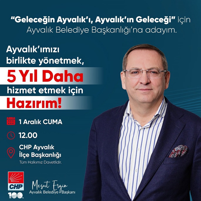 Ayvalık Belediye Başkanı Mesut Ergin, CHP'den Ayvalık Belediye Başkanlığı için Aday Adayı olduğunu belirterek, "Ayvalık’ı birlikte yönetmek, 5 yıl daha hizmet etmek için hazırım" dedi.