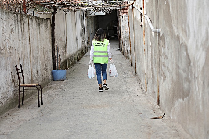 Bayraklı Belediyesi ekipleri tarafından hazırlanan paketler, iftar saati öncesinde ailelere teslim ediliyor.