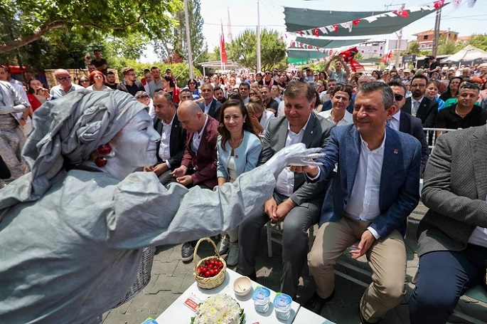 Bornova Belediye Başkanı Ömer Eşki, üzerinde “İkinci Yüzyılın İlk Lideri” yazılı poşuyu Özel’e hediye etti. Kiraz yetiştiricilerinin ürünlerini sergilediği festivalde, pek çok yöresel ürün de tezgâhlardaki yerini aldı.