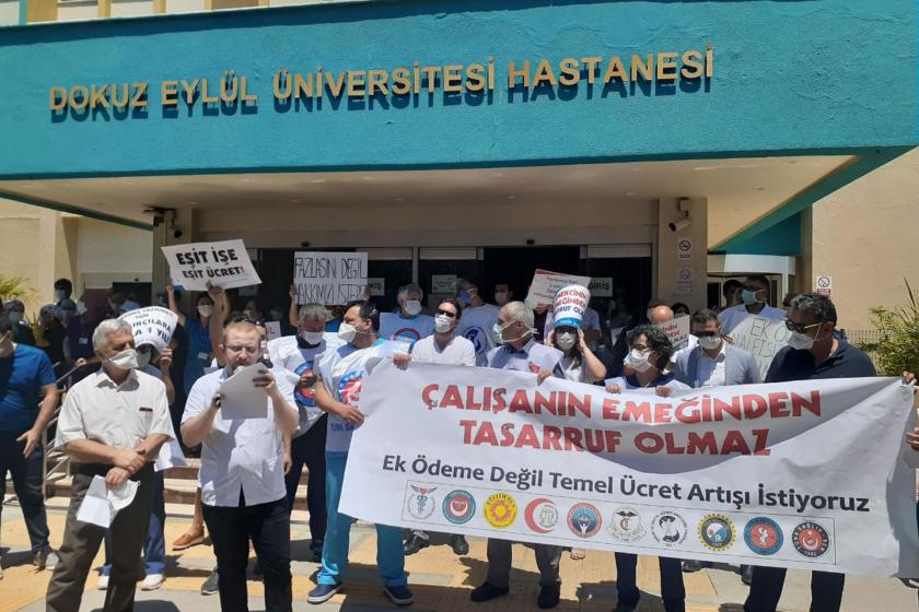 Sağlık-İş üyesi Dokuz Eylül Üniversitesi Tıp Fakültesi Hastanesi işçileri ile hastane yönetimi arasında süren toplu iş sözleşmesi (TİS) görüşmelerinde anlaşma sağlanamadı. Hastane yönetiminin ücret teklifi için ‘asgari ücret’ zammını beklemesi görüşmeleri tıkadı. TİS görüşmelerinde 60 günlük yasal süre doldu, ara bulucu aşamasına gelindi. 2021 yılı asgari ücret tutarının belirlenmesi ile beraber hastane yönetiminin ücret zammı teklifi vermesi bekleniyor. Ara bulucu aşamasında da anlaşmanın sağlanamaması halinde işçilerin grev kararı alması yasal olarak mümkün hale geliyor. TİS görüşmeleri 1500 işçiyi ilgilendiriyor.