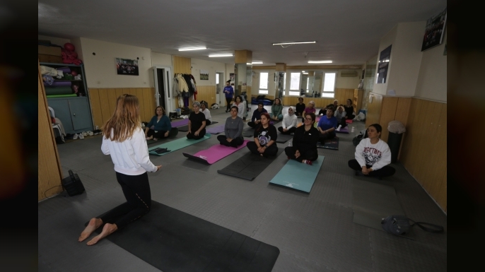 Haftanın ortasında bir araya gelen kadınlar, yoga ve meditasyon çalışmalarıyla stres atma, bedenlerini güçlendirme ve zihinsel olarak rahatlama imkânı buluyor.