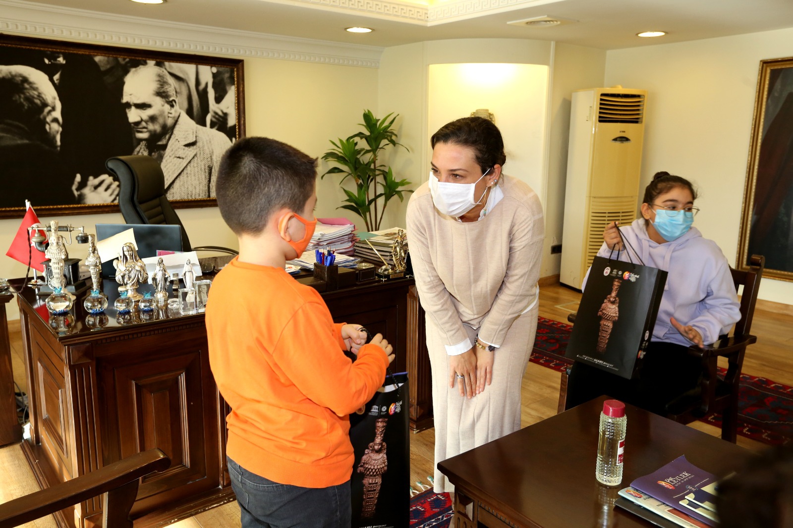 Efes Selçuk’un kitap kurtları Başkan Filiz Ceritoğlu Sengel ile bir araya geldi. Efes Selçuk Belediyesi Prof. Dr. İsmail Aka Kütüphanesi üyelerinden Beren Deniz Kınay, Oğuzhan Karahan, Turhan Köse, Gülay Karahan ve Saniye Köse yıl boyu en fazla sayıda kitabı okuyarak örnek bir davranışa imza attılar. Farklı yaş gruplarından oluşan kitap kurtlarıyla bir araya gelen Başkan Sengel, öğrencilere Mustafa Kemal Atatürk’ün Nutuk eserini hediye etti.