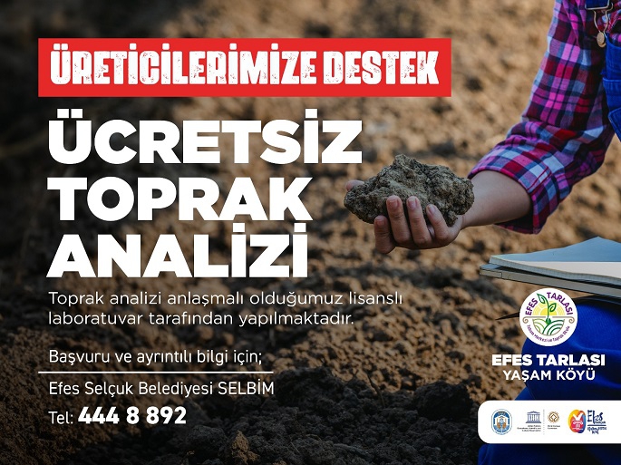 Doğayı, suyu, toprağı korumak; çiftçinin bilinçli ve doğru gübreleme ile girdi maliyetlerinin düşürülmesi, birim alandan daha fazla verim ve kazanç elde edilmesi amacıyla ücretsiz toprak analizi hizmeti veriliyor. Efes Selçuk Belediyesi tarafından verilen Ücretsiz Toprak Analizi Hizmetinden bugüne kadar 163 üretici yararlandı.