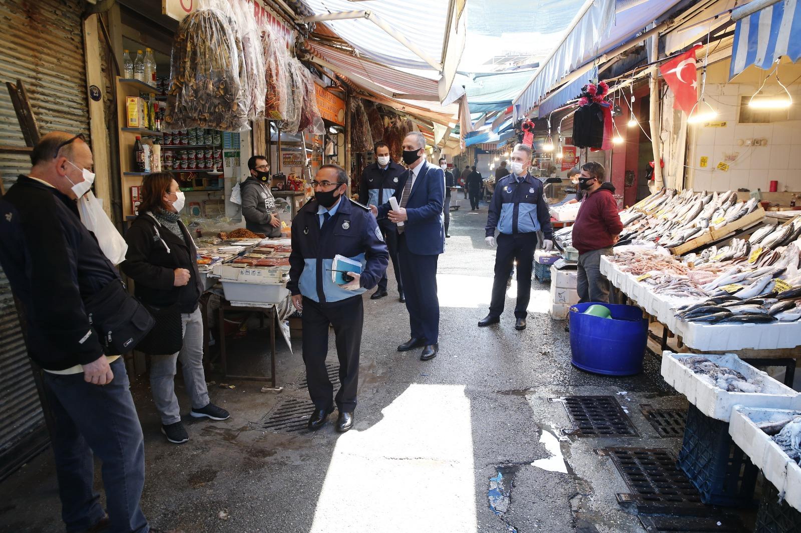 Havra Sokağı’nda sıkı bir denetim uygulayan Konak Belediyesi zabıta ekipleri, bariyerlere ek olarak sokağa giriş çıkış yapan vatandaşlar için dezenfektan ve maske de bulunduruyor. Zabıta personeli, esnafla beraber vatandaşı da bilgilendiriyor. Zorunlu haller dışında evden çıkılmaması gerektiği vatandaşa hatırlatılırken, alışveriş sırasında uymaları gereken hijyen ve sosyal mesafe kuralları da anlatılıyor.