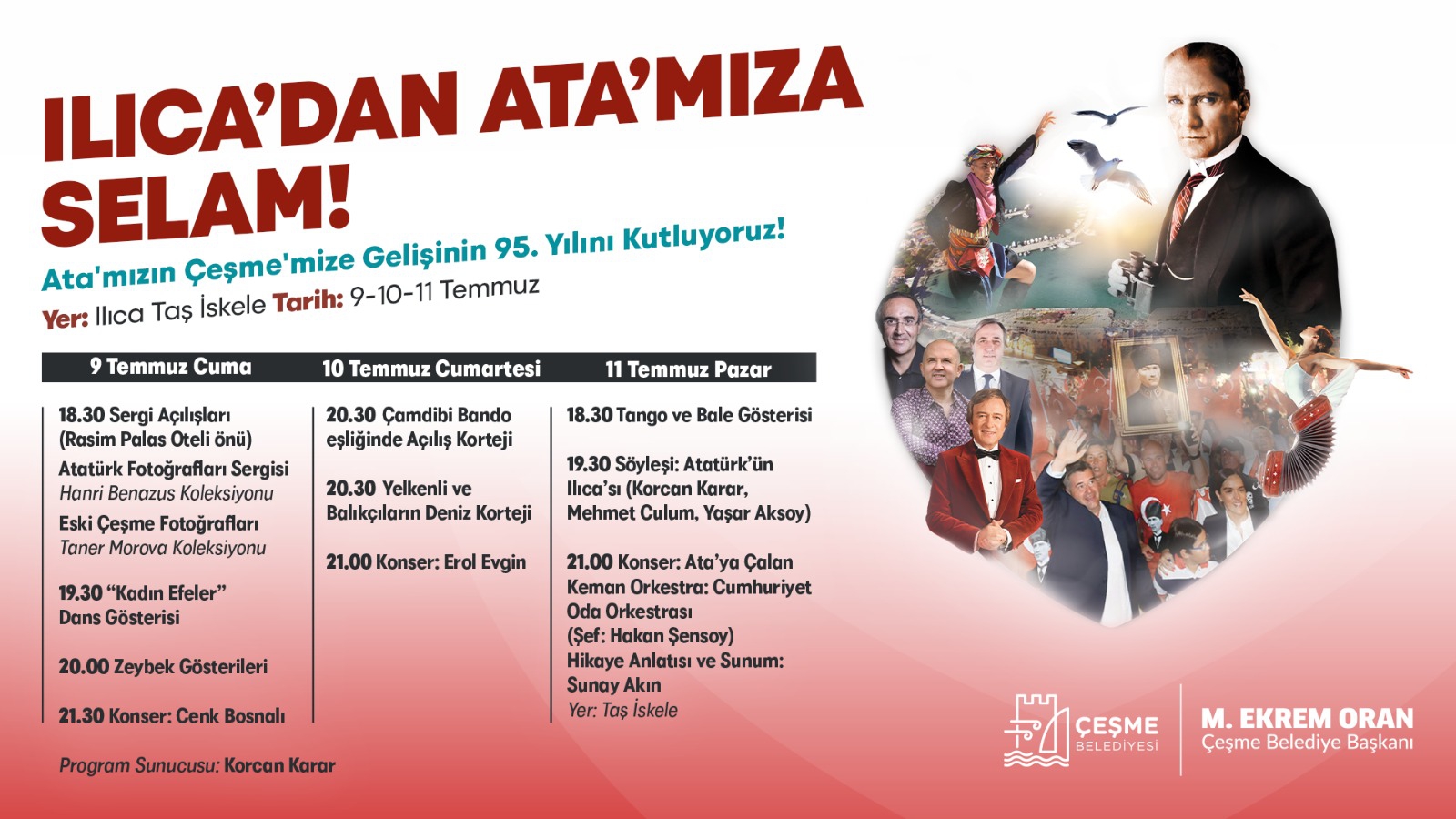 Çeşme Belediyesi Mustafa Kemal Atatürk’ün Ilıca’ya gelişinin 95. yılını “Ilıca’dan Ata’mıza Selam” etkinlikleri kapsamında kutlayacak. Erol Evgin, Sunay Akın, Cenk Bosnalı gibi isimlerin sahne alacağı anma töreni bir dizi etkinlikle gerçekleştirilecek.