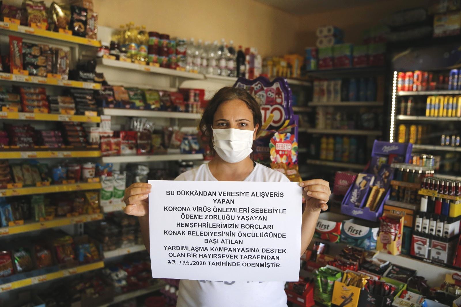 Konak Belediyesi’nin dayanışma çağrısını yanıtsız bırakmayan hayırseverler, salgın nedeniyle dara düşerek, esnaftan veresiye alışveriş yapan vatandaşların borçlarını ödüyor.