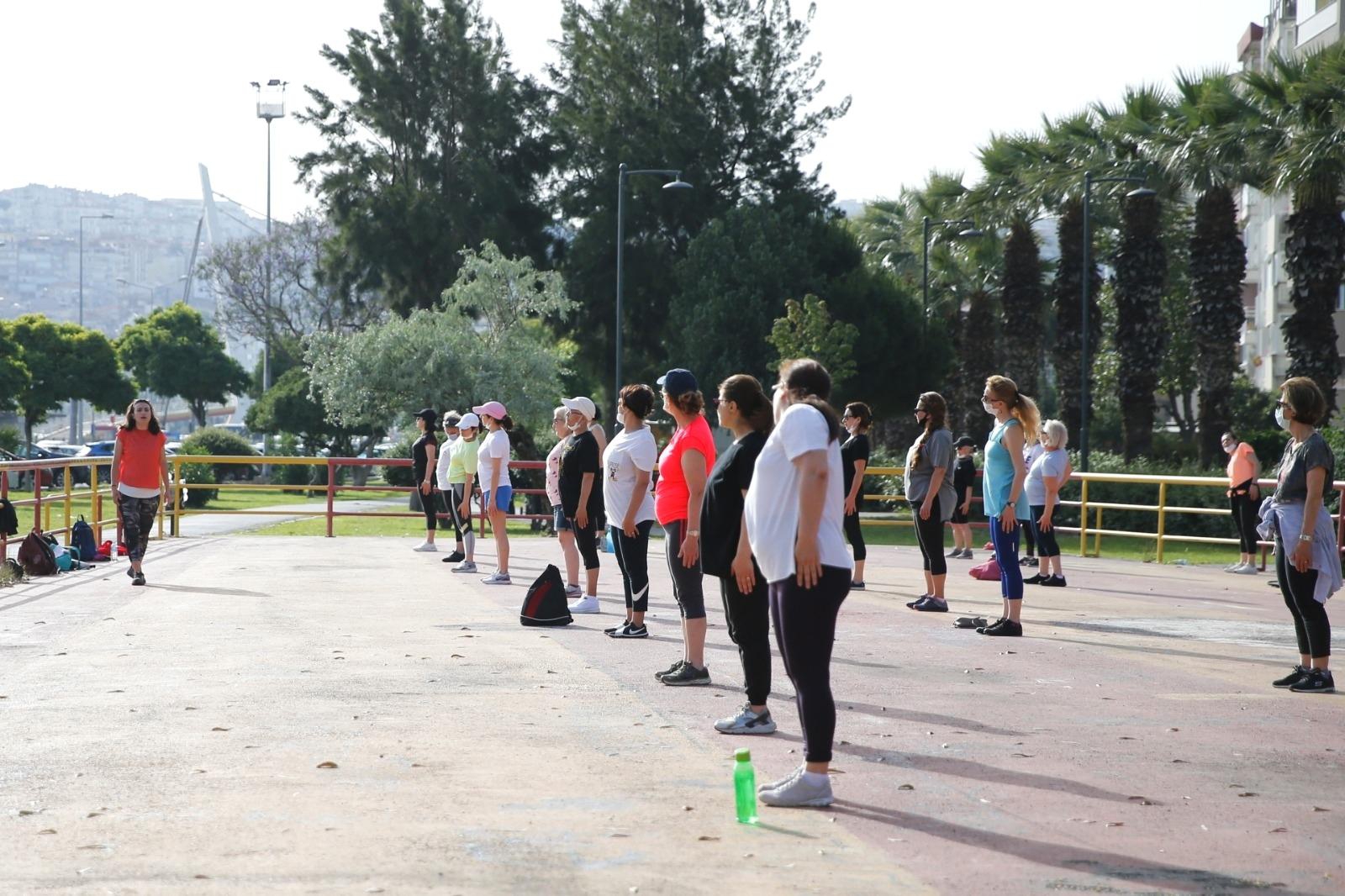 Konak Belediyesinin koronavirüs nedeniyle ara verdiği aerobik, step ve pilates kursları açık havada yeniden başladı