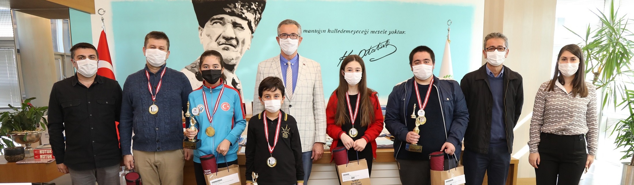 Gaziemir Belediyesinin düzenlediği 54 ilden 514 sporcunun katıldığı çevrim içi satranç turnuvasında dereceye girenler Belediye Başkanı Halil Arda’dan ödüllerini aldı.