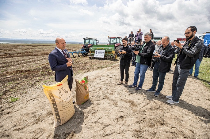 Dağıtımın ardından ekim yapılacak tarlaya gidildi. Burada konuşan İzmir Büyükşehir Belediye Başkanı Tunç Soyer, “Yaptığımız şey bugün biraz daha bayrama ve kutlamaya dönüştü. Gerçekten Anadolu öyle bir coğrafya ki biz İzmir’de hasada hazırlanıyoruz burada ekime geldik. Bir tarafta hasat bir tarafta ekim yapılabilen olağanüstü bir coğrafyada yaşıyoruz. Ve bu yoksulluk bu kuraklık hiçbirimizin hak etmediği bir tablo. Emin olun ki bu bir kader değil. Çünkü bu bereketli toprakların bereketini birileri hortumlasın diye onlara aktardılar. Buradaki küçük üreticiyi yoksullaştırdılar. Bu bir politik, siyasi bir tercihti. Bu tercihin sonuçlarını yaşıyoruz bugün Anadolu’da. Karşılaştığımız yoksulluk, kuraklık tamamen yanlış tarım politikalarının sonucudur, bir kader değildir. Onun için 'başka bir tarım mümkün' diyoruz. Bu bereketli toprakların bereketiyle karnını doyuran, yüzlerce yıldır atasından devraldığı topraklarda huzurlu yaşamını devam ettiren, sağlıklı, güle oynaya hayatını devam ettiren köylümüz, üreticimiz artık üretimden vazgeçme noktasına, hayvanını kesme noktasına gelmiştir. Biz buğday ve arpa tohumu getirirken aslında buraya umudu yeşertmeye geldik buraya. Çünkü biliyoruz ki bu mümkün. El ele verirsek başarırız. Bu yanlış tarım politikalarını değiştirip küçük üreticiden, köylüden yana uygulama yaparsanız işte bu mümkün. Ne demiş Mustafa Kemal Atatürk? Köylü milletin efendisidir. Neden demiş? Çünkü bilmiş ki eğer kendi kendine yeten bir ekonomi yaratabilirse bir memleket dışarıya muhtaç olmaz ve o zaman kalkınmanın, büyümenin önü açılır. Ne yaptık köylümüzü? Tunuslu, Faslı, Kanadalı üreticinin önünde ezdirdik. Mercimeği Kanada’dan sıfır vergiyle ithal ediyoruz. Sen niye buradaki üreticinin vergisini sıfırlamıyorsun? Bu nasıl bir kafa, nasıl bir tercih? Bunların hepsi değişecek. Bunların hepsini değiştirmeye muktediriz. 'Başka bir tarım mümkün'. Yine bu topraklarda kadim kültürün evlatları olarak güler yüzle, sağlıkla, huzurla yaşayacağımız günleri hep beraber kuracağız” açıklamasını yaptı.